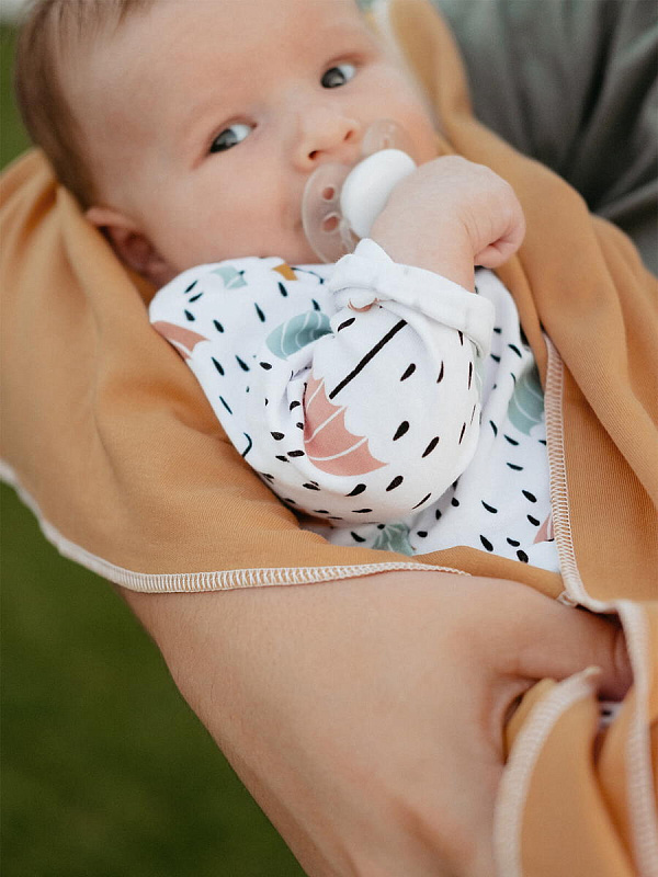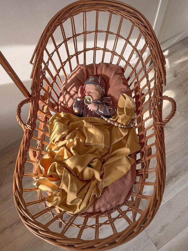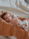 Пелёнка изготовлена из трикотажного хлопка под названием интерлок. Интерлок – это плотный трикотаж двойного плетения хлопчатобумажных нитей. Одежда из такого материала долго носится, практически не мнётся, хорошо сохраняет цвет и форму.