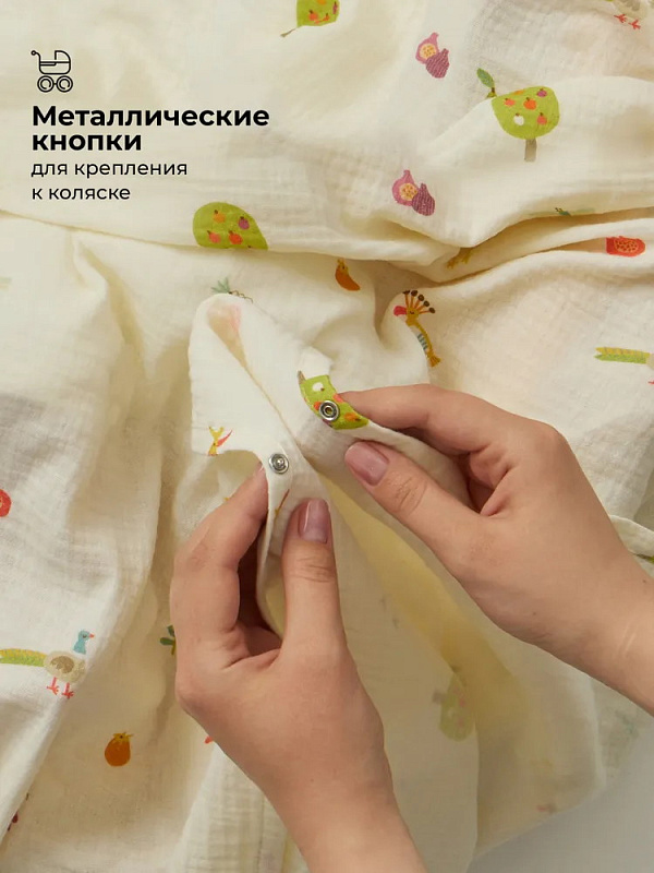с помощью специально разработанных кнопок закрепить на коляске для защиты от ветра, ультрафиолета и насекомых;