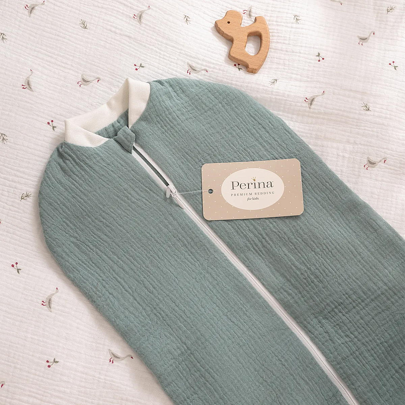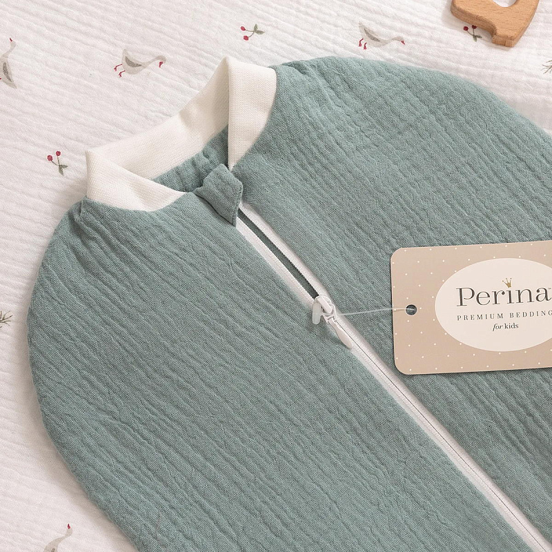 Материал кокона - высококачественный двухслойный жатый муслин, 100% эко хлопок. Он легкий, воздушный и невероятно приятный на ощупь. Муслин прекрасно впитывает влагу, быстро сохнет и сохраняет свою мягкость и цвет даже после множества стирок. Подкладка спальника выполнена так же из двухслойного муслина. Все швы спрятаны внутрь, что делает использование спальника более комфортным и безопасным.