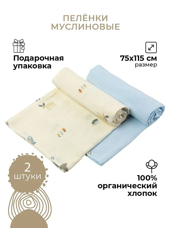 Пелёнки муслиновые Buba Kids, 2 шт, 75х115 см BKMUSSW15 Таежная ночь/ нежно-голубой