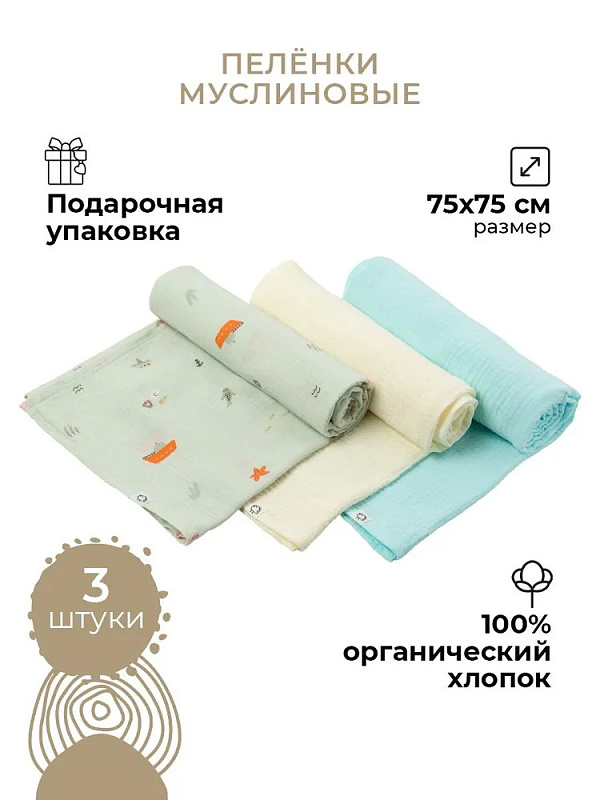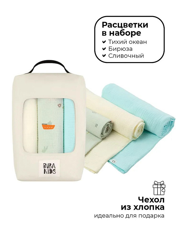 Пелёнки муслиновые Buba Kids, 3 шт, 75х75 см BKMUSSW11 Тихий океан/ бирюза/ сливочныйНет оценокХарактеристики