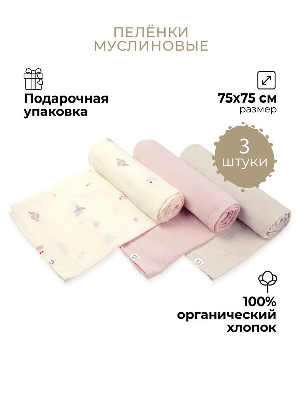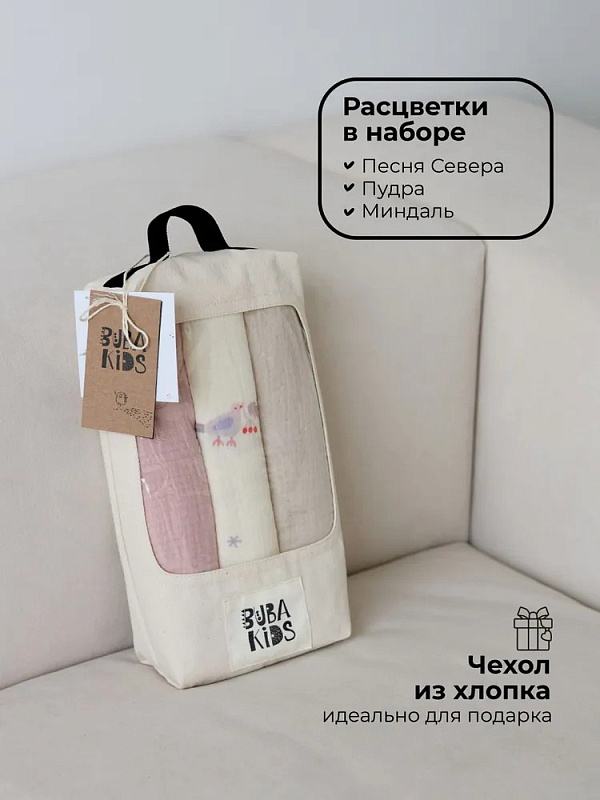 Пелёнки муслиновые Buba Kids, 3 шт, 75х75 см BKMUSSW43 Песня Севера/ пудра/ миндальНет оценокХарактеристики