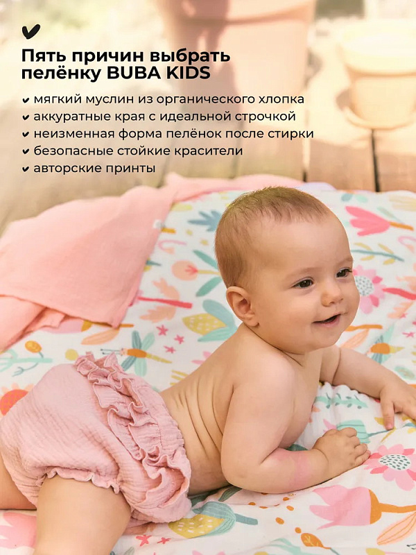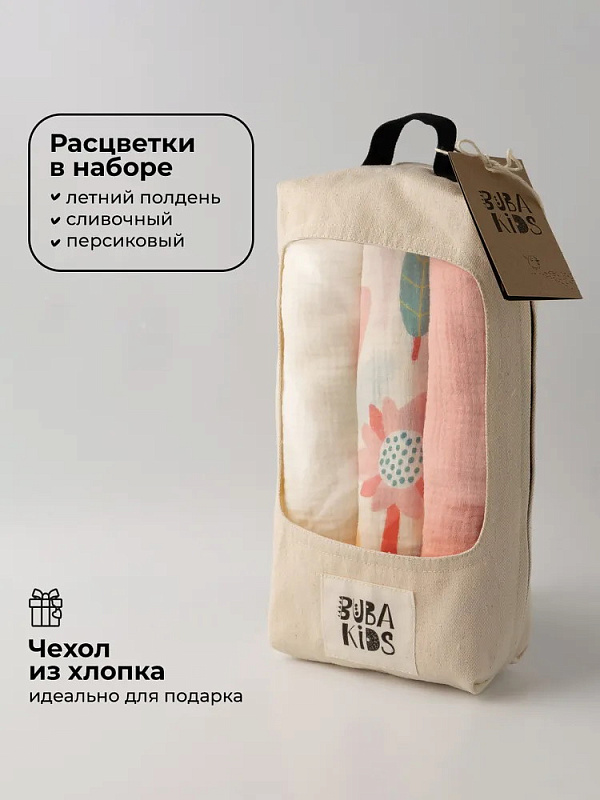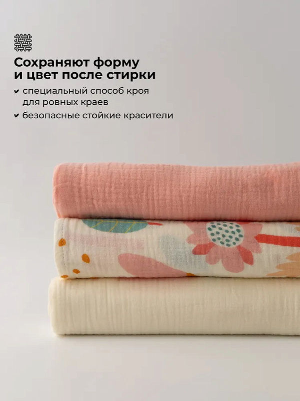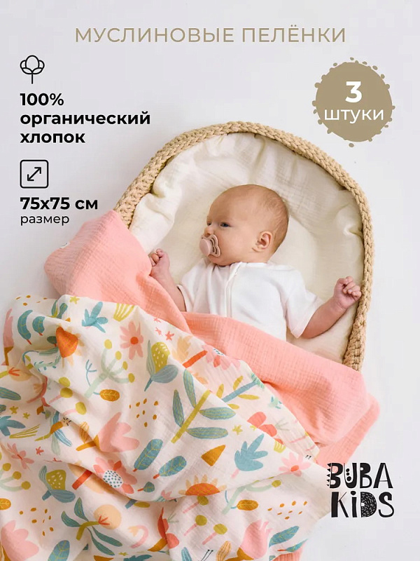 Пелёнки муслиновые Buba Kids, 3 шт, 75х75 см BKMUSSW53 Летний полдень/ сливочный/ персиковыйНет оценокХарактеристики