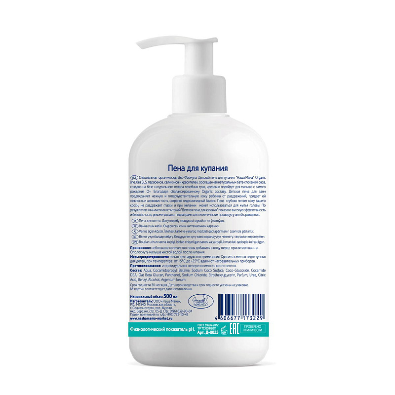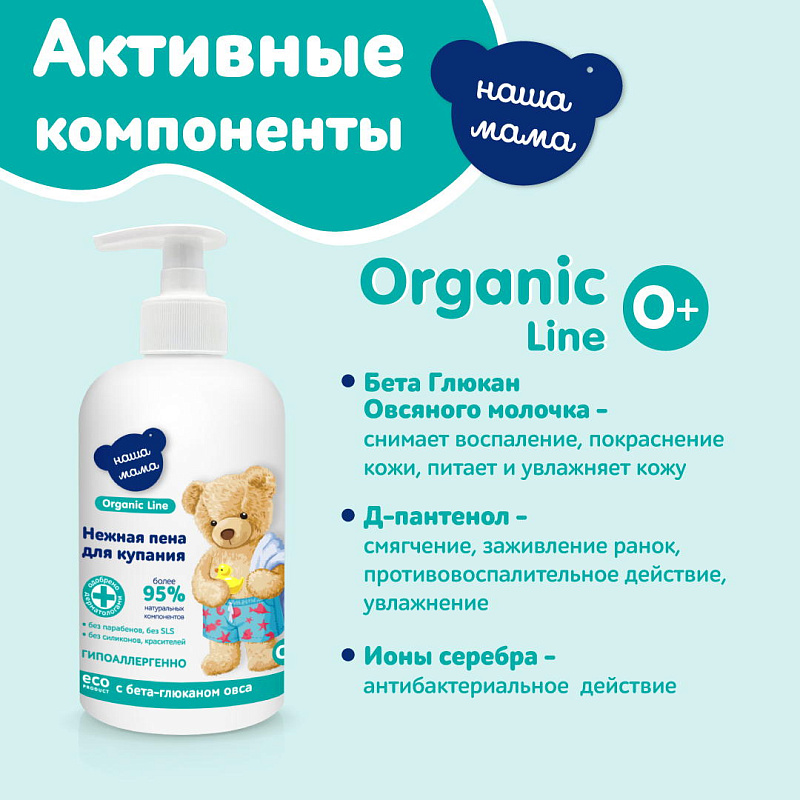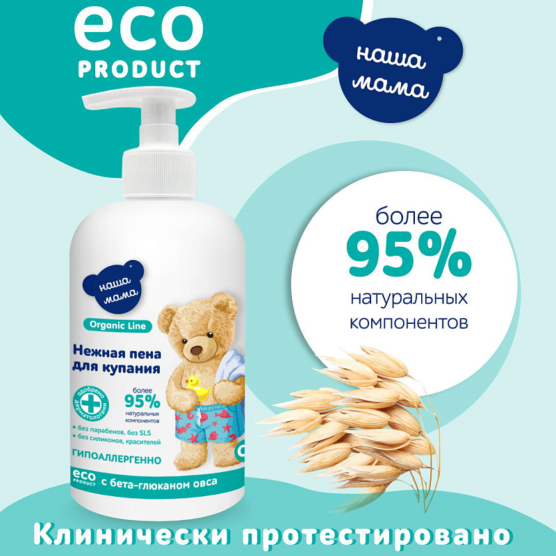 Специальная органическая эко-формула детской пены для купания серии "Наша мама Organic Line" создана на основе натурального отвара лечебных трав и обогащена натуральным бета-глюканом овса, идеально подойдет для малыша с самого рождения 0+. Пена "Наша мама Organic Line" не содержит SLS, парабенов, силиконов и красителей. Благодаря сбалансированному натуральному составу, детская пена для ванны предохраняет нежную и гиперчувствительную кожу ребенка от раздражения, глубоко питает кожу, предаст ей нежность и шелковистость, сохранит гидролипидный баланс. Пена "Наша мама Organic Line" не раздражает глазки и при необходимости может использоваться для мытья головы.