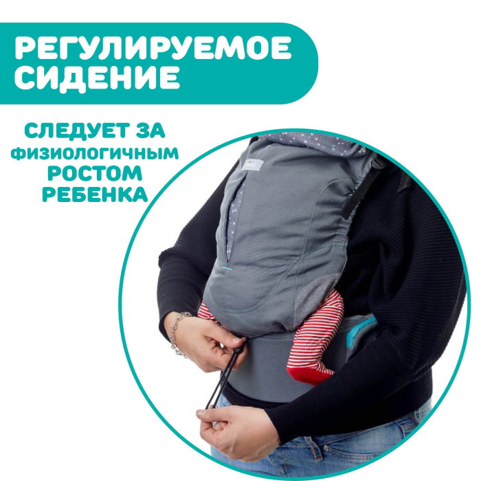- Регулируется по глубине благодаря специальной прорези на передней части переноски, которая поддерживает естественное С-положение спинки, адаптируясь к телу ребёнка на протяжении его роста