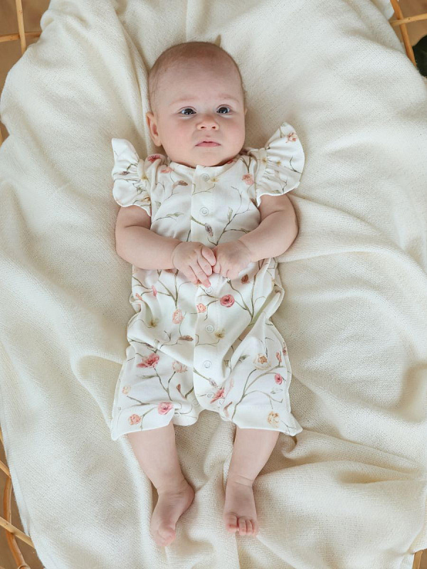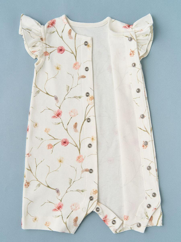 Стильный песочник для девочки с очаровательным принтом “Цветочки на веточках” - воплощение комфорта и нежности для вашего ребенка.