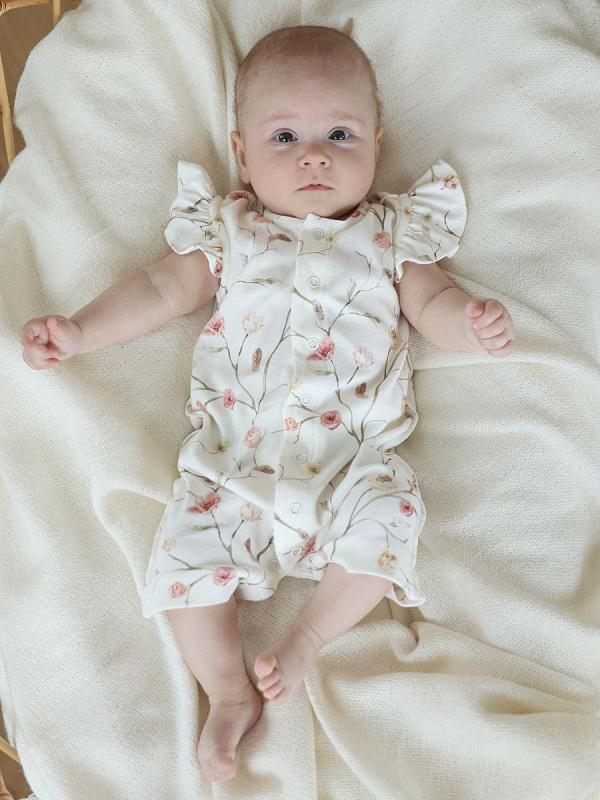 Стильный песочник для девочки с очаровательным принтом “Цветочки на веточках” - воплощение комфорта и нежности для вашего ребенка.