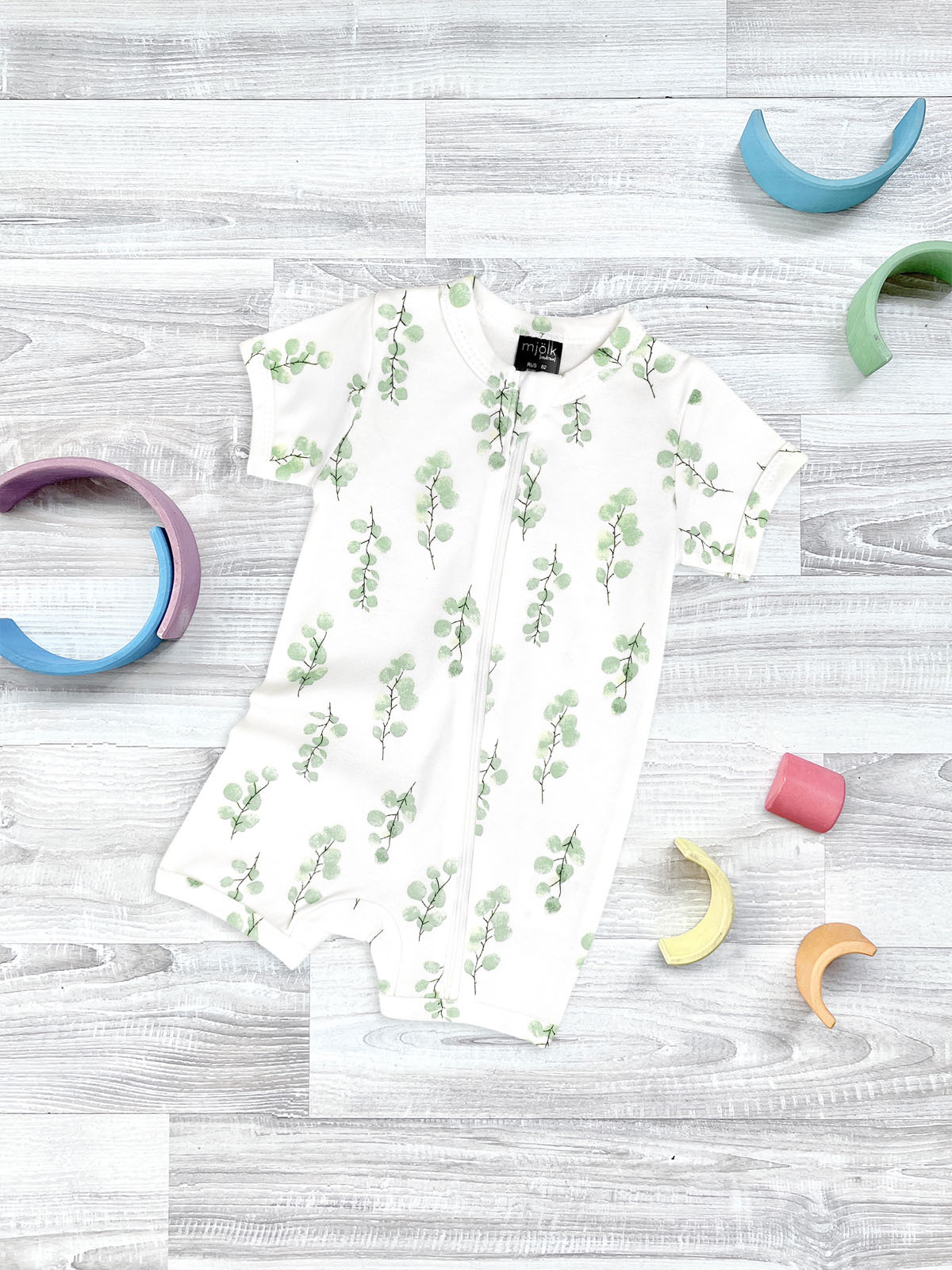 Песочник Mjölk [мьёльк] Sleep and Play Эвкалипт – это комбинезон на молнии с короткими рукавами и штанинами, выполненный из плотного и очень мягкого трикотажа.