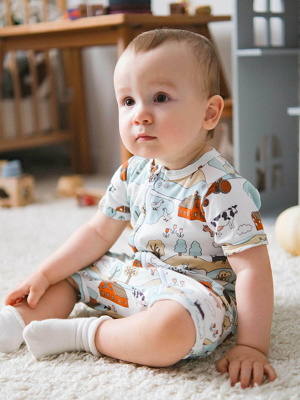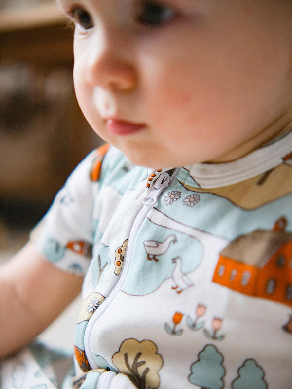 Песочник Mjölk [мьёльк] Sleep and Play Ферма – это комбинезон на молнии с короткими рукавами и штанинами, выполненный из плотного и очень мягкого трикотажа.