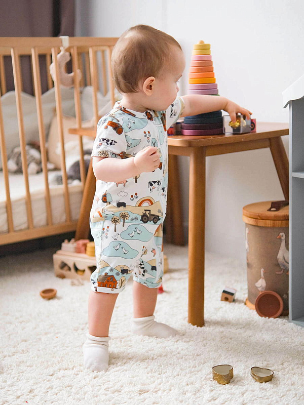 Песочник Mjölk [мьёльк] Sleep and Play Ферма – это комбинезон на молнии с короткими рукавами и штанинами, выполненный из плотного и очень мягкого трикотажа.