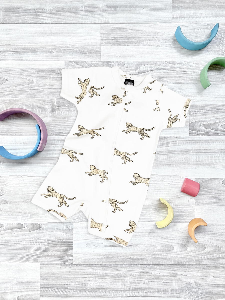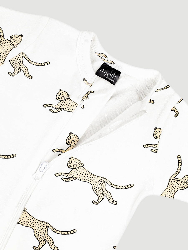 Песочник Mjölk [мьёльк] Sleep and Play Гепарды – это комбинезон на молнии с короткими рукавами и штанинами, выполненный из плотного и очень мягкого трикотажа.