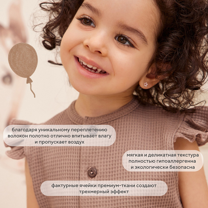 Эксклюзивная коллекция WAFFY буквально соткана из заботы и наполнена бесконечной любовью к нашим маленьким клиентам. Деликатные спокойные расцветки, натуральные ткани премиум-класса (фактурный вафельный трикотаж), качественная фурнитура, комфортное лекало, лаконичное исполнение, сочетающиеся между собой изделия - визитная карточка нашей одежды для малышей.