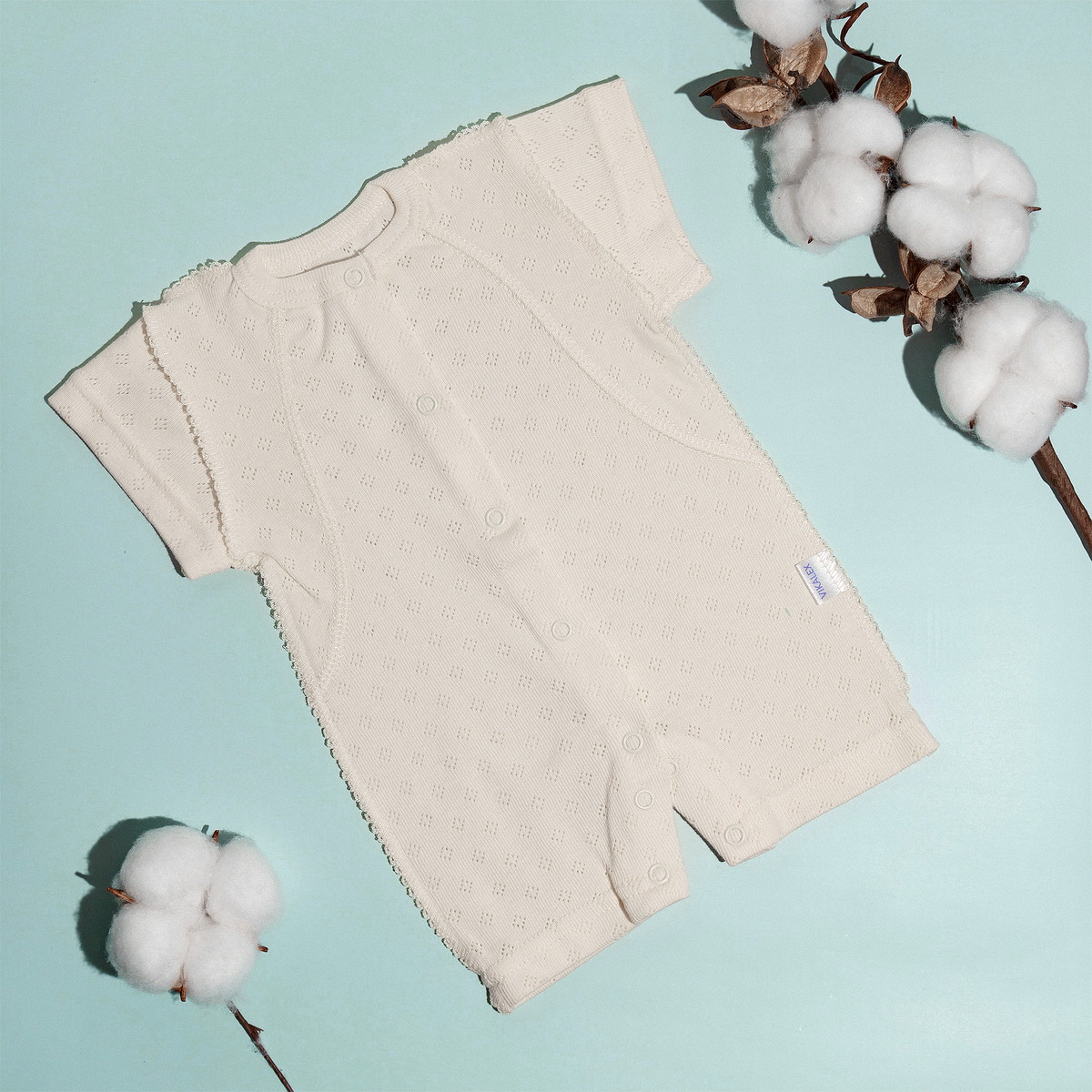 Песочник Vikalex «Ажур экрю» — идеальный выбор для вашего новорождённого малыша. Он изготовлен из высококачественного 100% хлопка (рибана) и оснащён удобными кнопками для комфортной носки.