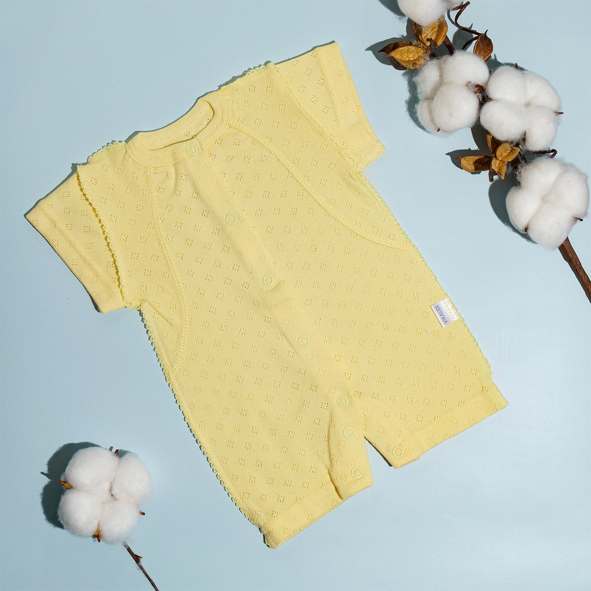 Песочник Vikalex «Ажур жёлтый» — идеальный выбор для вашего новорождённого малыша. Он изготовлен из высококачественного 100% хлопка (рибана) и оснащён удобными кнопками для комфортной носки.