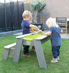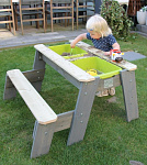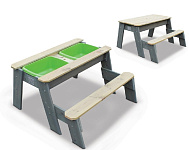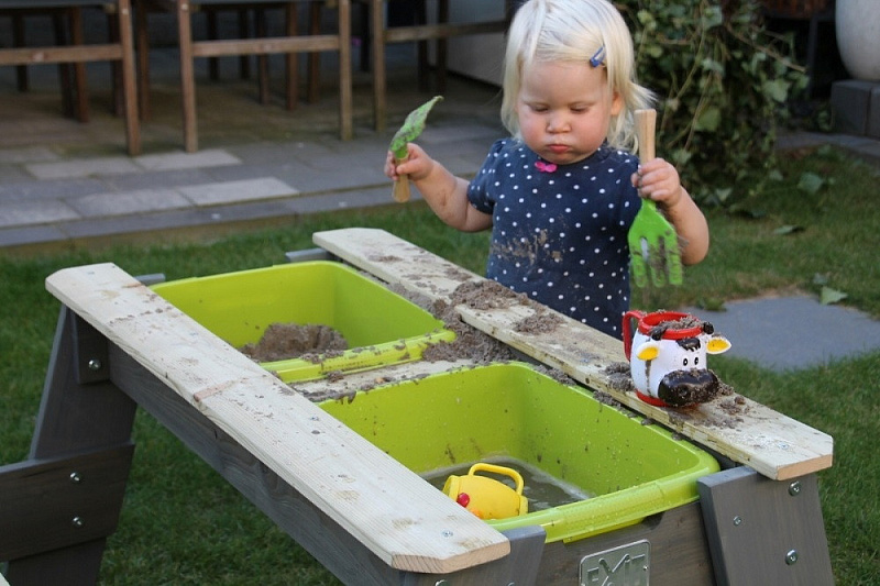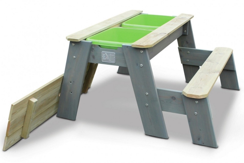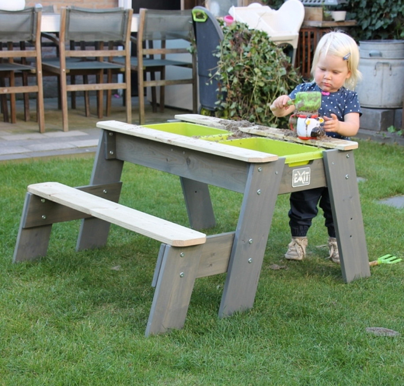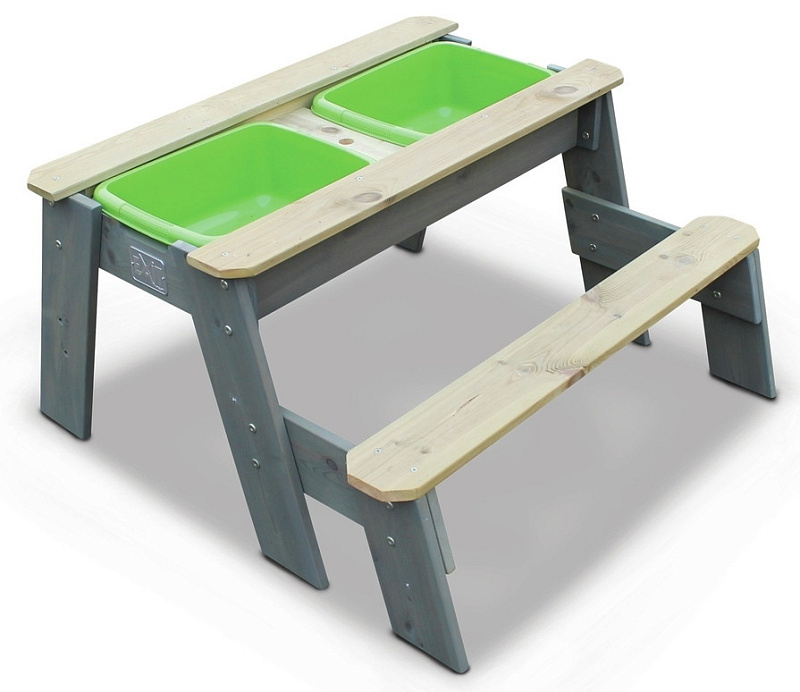 Имеет два зеленых контейнера, которые можно наполнить водой или песком, они также тлично подойдут для хранения игрушек. Контейнерылегко снимаются, что позволяет их в любой момент помыть и играть по новым правилам. Благодаря скамейке дети могут сделать выбор, как им удобнее будет играть — стоя или сидя. Надоело играть с песком или водой — просто закройте песочницу крышкой и используйте кее ак стол для творчества, рисования, строительства или пикника.Песочница АКЦЕНТ от EXIT Toys в виде столика со скамейкой - лучшее решение для игр детей.