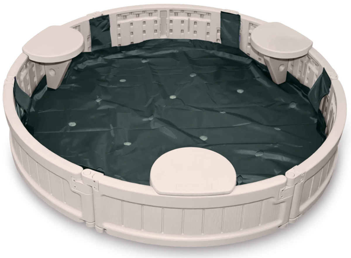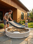 Особого внимания заслуживает защитный тент из прочного полиэстера с усиленной резинкой по периметру. Тент эффективно защищает внутреннее пространство песочницы от влаги, пыли и солнца.