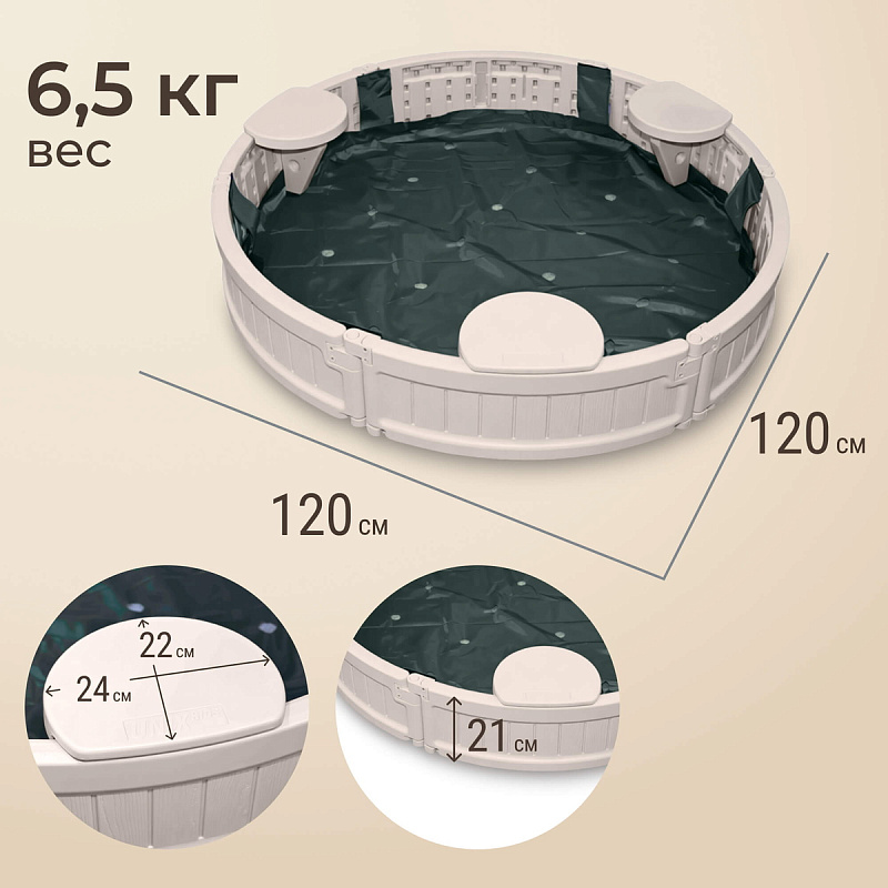 Детская круглая песочница с защитным чехлом UNIX Kids для улицы и дома – это увлекательное и функциональное игровое пространство, идеально подходящее для активного отдыха детей дошкольного возраста. Она выполнена в форме круга D120 см и оснащена 3-мя удобными сиденьями для комфортного размещения детей во время игры. Каждое сиденье рассчитано на нагрузку до 25 кг. Максимальная вместительность составляет до 200 кг песка (около 150 литров), что позволяет создать обширную зону для творчества и развлечений.
