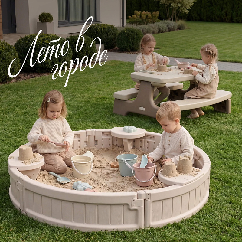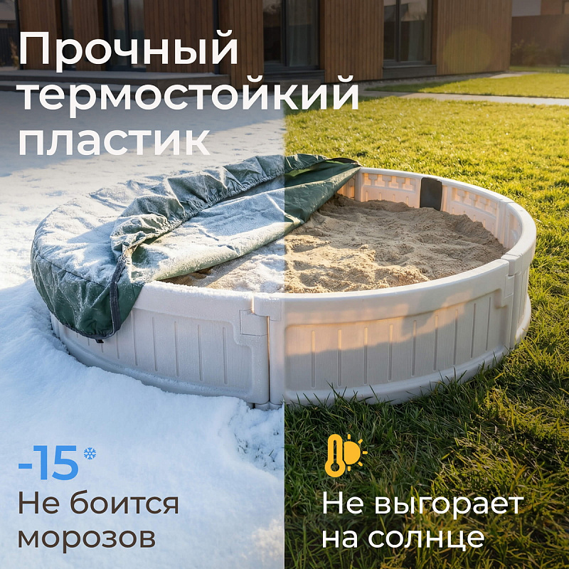 Материал изготовления — прочный термостойкий пластик, устойчивый к воздействию солнечных лучей и сохраняющий привлекательный внешний вид даже после длительного пребывания на открытом воздухе. Уличная пластиковая песочница сохраняет свою прочность и функциональность при температуре до -15 градусов, благодаря чему подходит для эксплуатации в регионах с холодным климатом. Специально разработанная форма без острых углов обеспечивает дополнительную защиту от случайных травм.