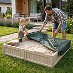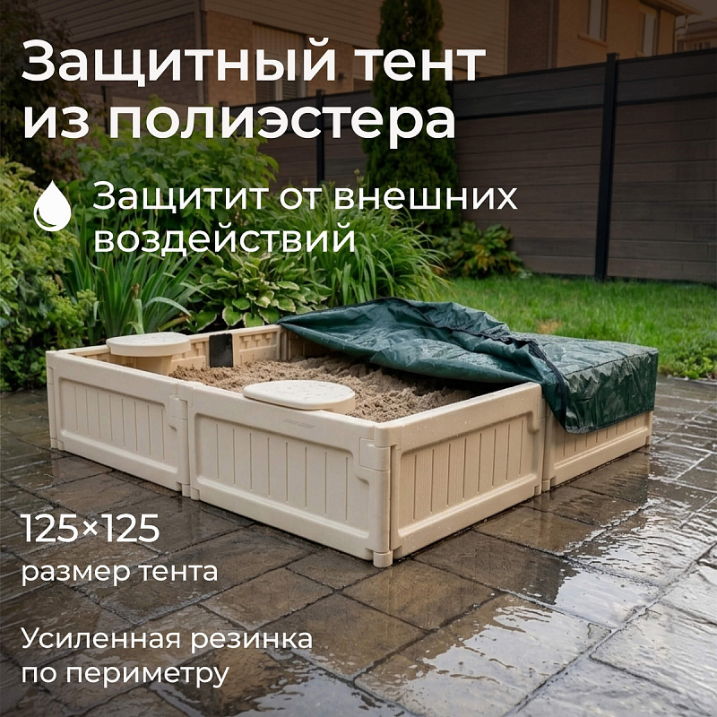 Особого внимания заслуживает защитный тент из прочного полиэстера с усиленной резинкой по периметру. Тент эффективно защищает внутреннее пространство песочницы от влаги, пыли и солнца.