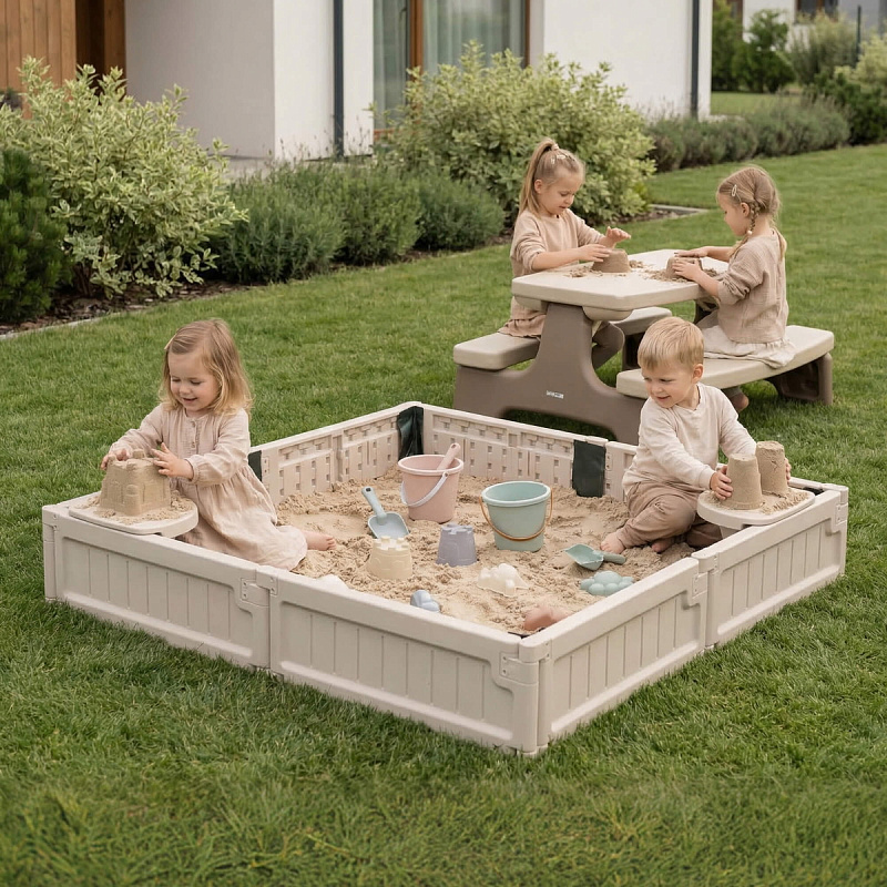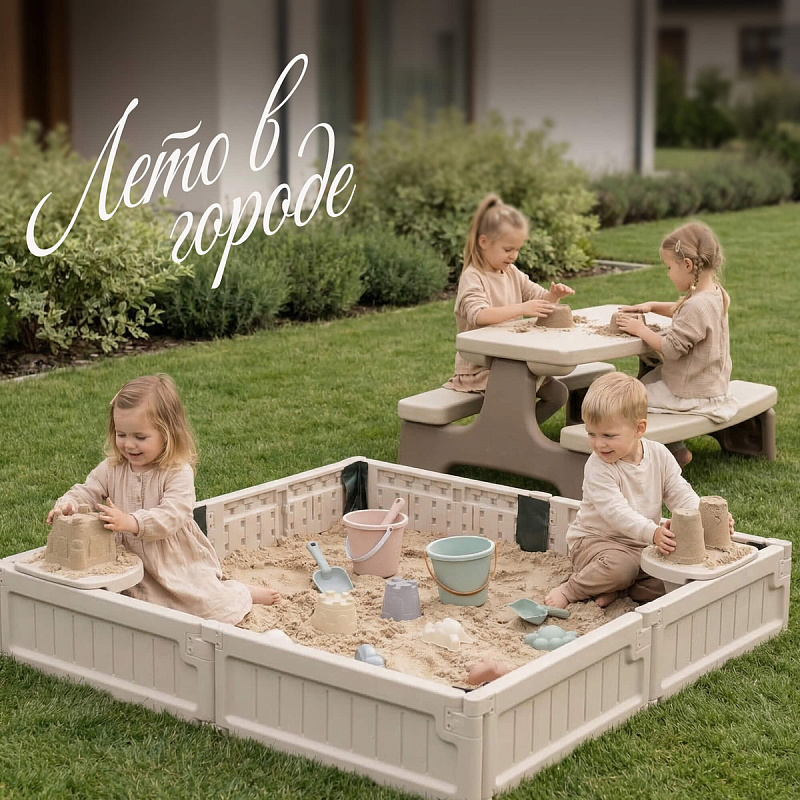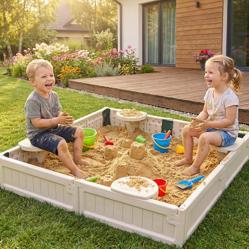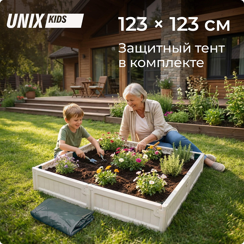 Детская квадратная песочница с защитным чехлом UNIX Kids для улицы и дома – это увлекательное и функциональное игровое пространство, идеально подходящее для активного отдыха детей дошкольного возраста. Она выполнена в форме квадрата 123 х 123 см и оснащена 4-мя удобными сиденьями для комфортного размещения детей во время игры. Каждое сиденье рассчитано на нагрузку до 25 кг. Максимальная вместительность составляет до 270 кг песка (около 180 литров), что позволяет создать обширную зону для творчества и развлечений.