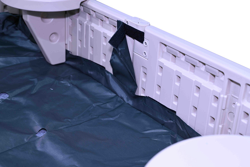 Конструкция оборудована специальным вкладышем из полиэстера, защищающим днище от попадания влаги и грязи. Вставка крепится на надежные липучки, легко снимается и быстро устанавливается обратно, позволяя родителям оперативно поддерживать чистоту игрового пространства.