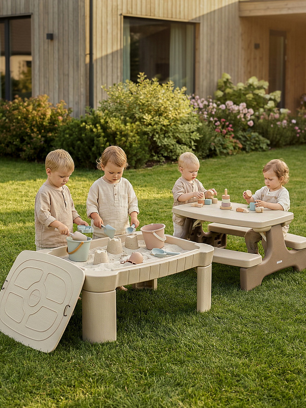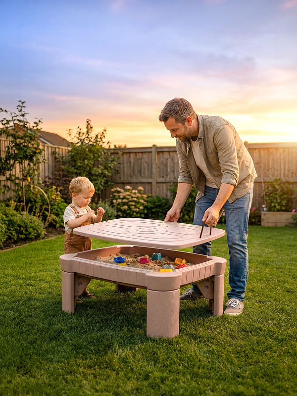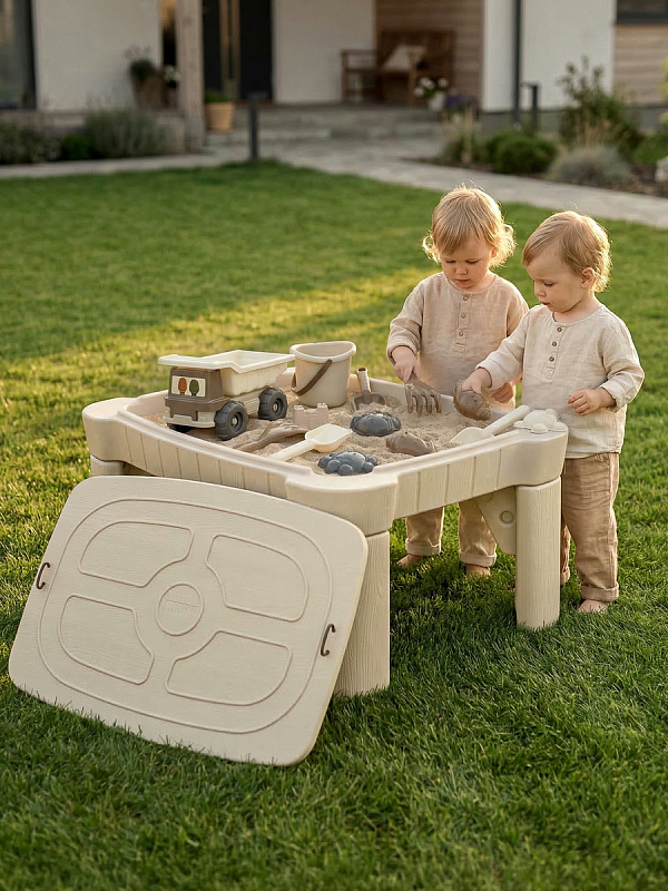 Крышка домашней / уличной песочницы оснащена удобными ручками, позволяющими легко закрывать изделие, защищая содержимое от влаги и загрязнений. Сборка проста и доступна каждому взрослому, не требует специальных инструментов и навыков, занимает минимум времени и усилий.