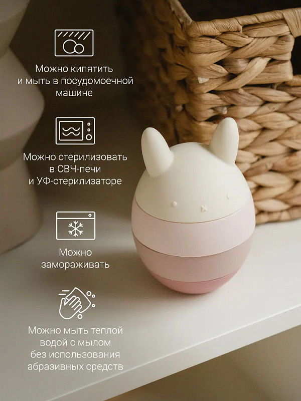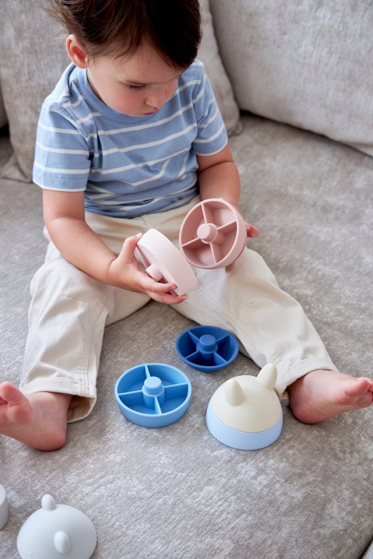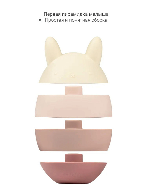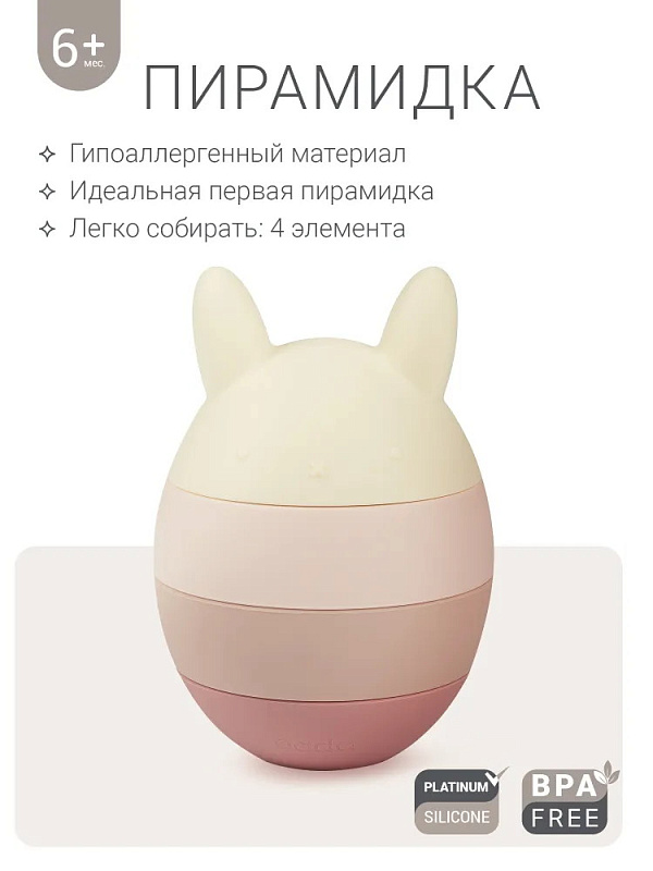 Пирамидка из гипоаллергенного силикона состоит из четырёх элементов разного размера, которые вместе образуют фигурку мишки. Подходит для малышей от полугода: сборка игрушки проста и понятна для самых маленьких. Игры с пирамидкой развивают логику, аналитическое мышление, внимание, память и усидчивость. Собирая детали в одну фигуру, малыш тренирует мелкую моторику. Все детали мягкие и без острых краёв, их можно брать в рот без вреда для дёсен. Пирамидка выполнена в нежных цветах, поэтому игрушка гармонично впишется в интерьер современной детской.