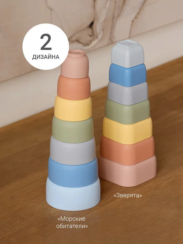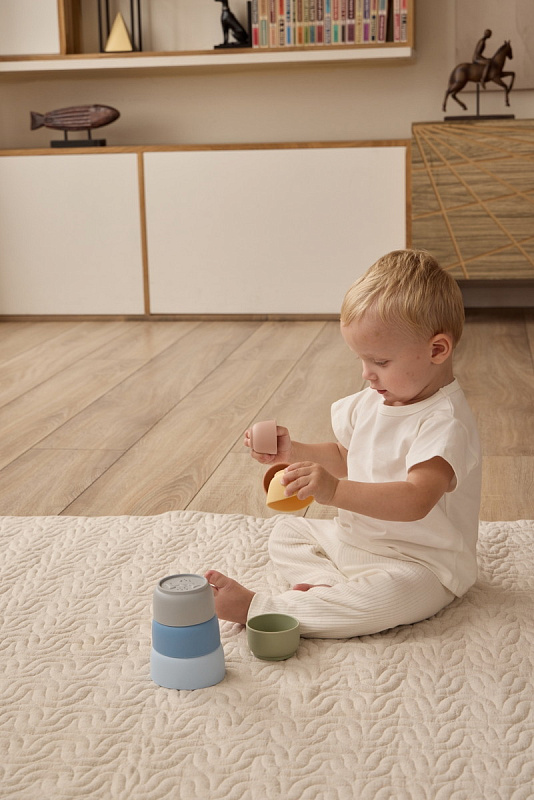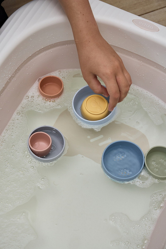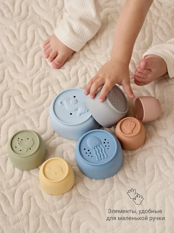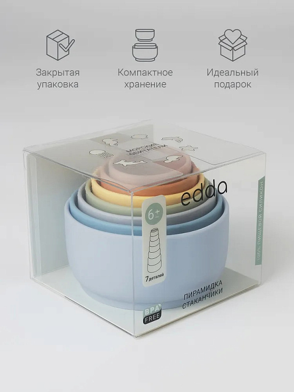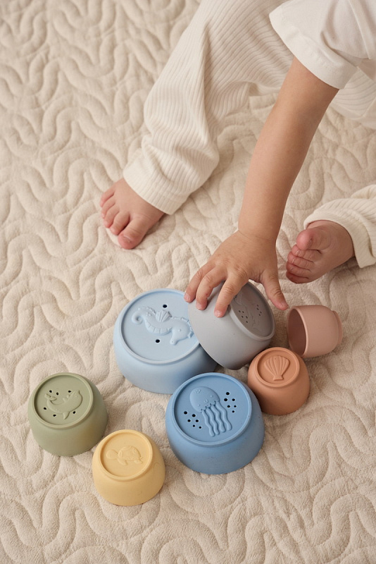 Набор edda состоит из семи стаканчиков разной формы, которые ребёнок может собирать в яркую пирамидку, развивая логику и моторику. Малыш знакомится с понятиями «больше-меньше», каждый стаканчик можно использовать отдельно для творческих игр с песком и водой. В коллекции — два дизайна: круглые стаканчики с морскими обитателями и квадратные с забавными зверятами на рельефном донышке. Оба набора выполнены из платинового силикона пастельных оттенков — безопасного, практичного и приятного на ощупь.