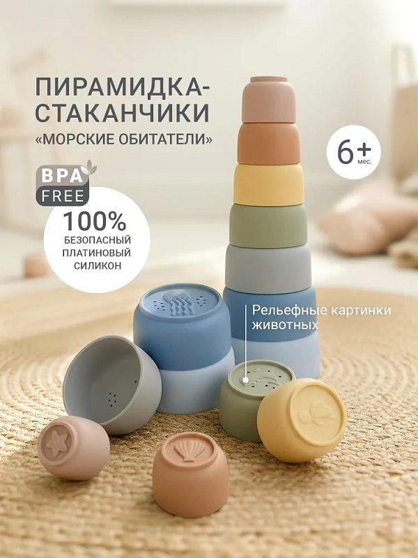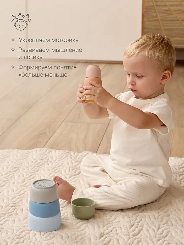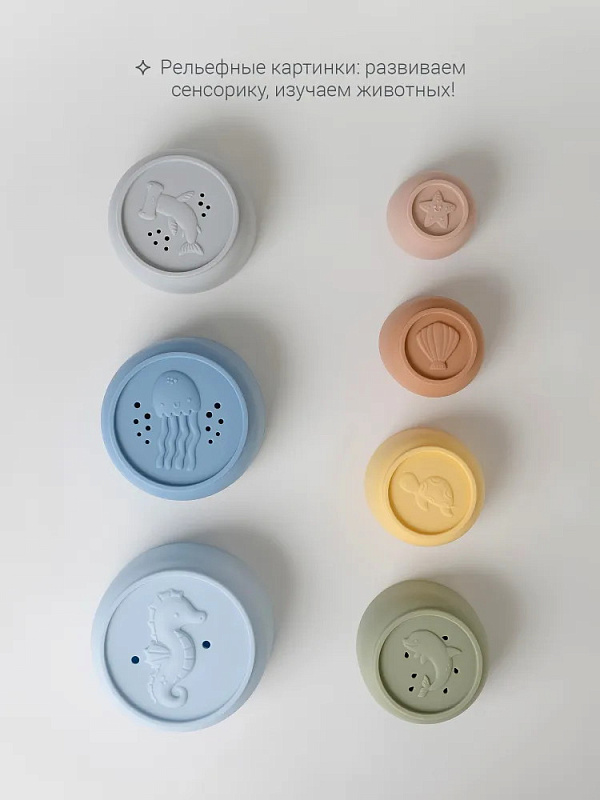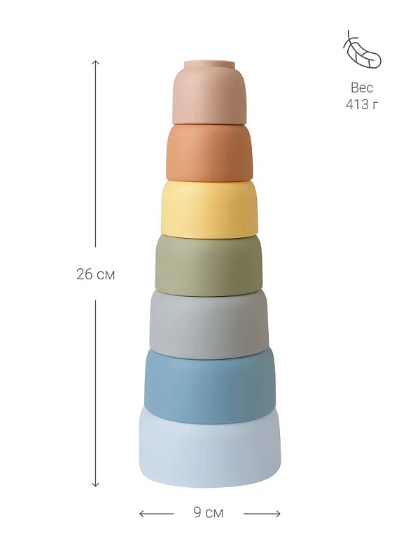 - Веселые игры, простота в уходе — в наборе есть стаканчики с дырочками: так играть с пирамидкой в воде или песке еще интереснее, например в дождик. Пирамидку легко промыть, стерилизовать или прокипятить.