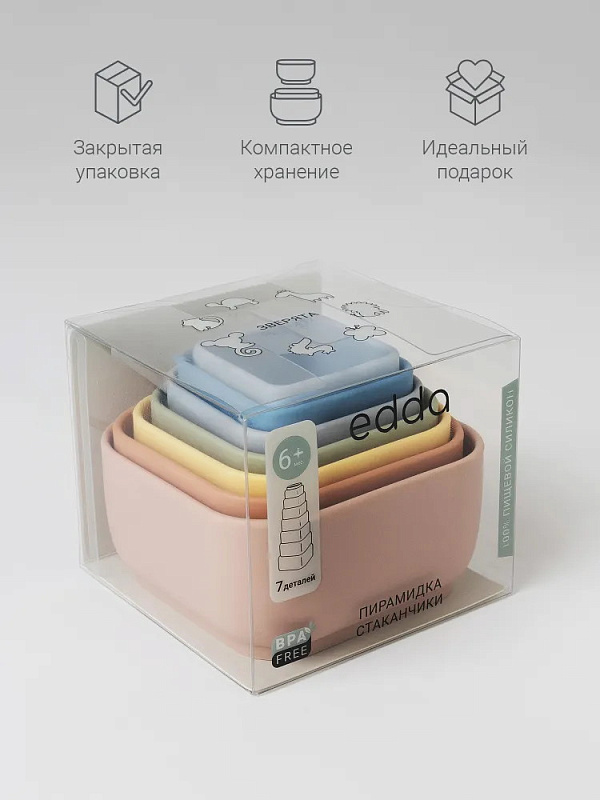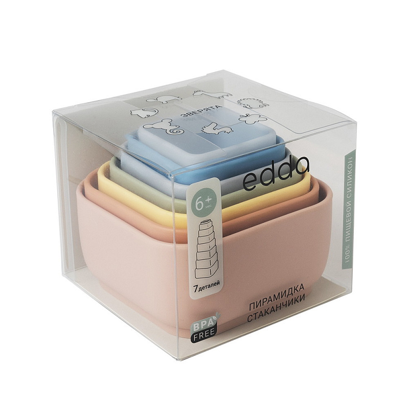 Набор edda состоит из семи стаканчиков разной формы, которые ребёнок может собирать в яркую пирамидку, развивая логику и моторику. Малыш знакомится с понятиями «больше-меньше», каждый стаканчик можно использовать отдельно для творческих игр с песком и водой. В коллекции — два дизайна: круглые стаканчики с морскими обитателями и квадратные с забавными зверятами на рельефном донышке. Оба набора выполнены из платинового силикона пастельных оттенков — безопасного, практичного и приятного на ощупь.