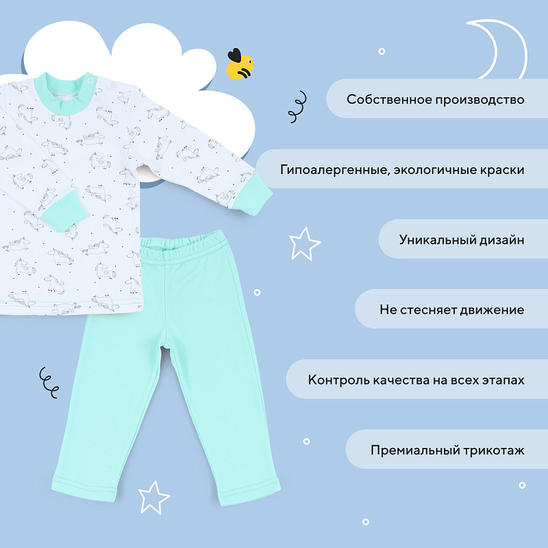 Очаровательная пижамка поможет малышу плавно погрузиться в сладкий сон. Мягкая резиночка, которой дополнены штанишки, не будет давить на крохотный животик. А кнопочки, которыми обеспечена горловина лонгслива, помогут беспрепятственно переодевать ребенка.