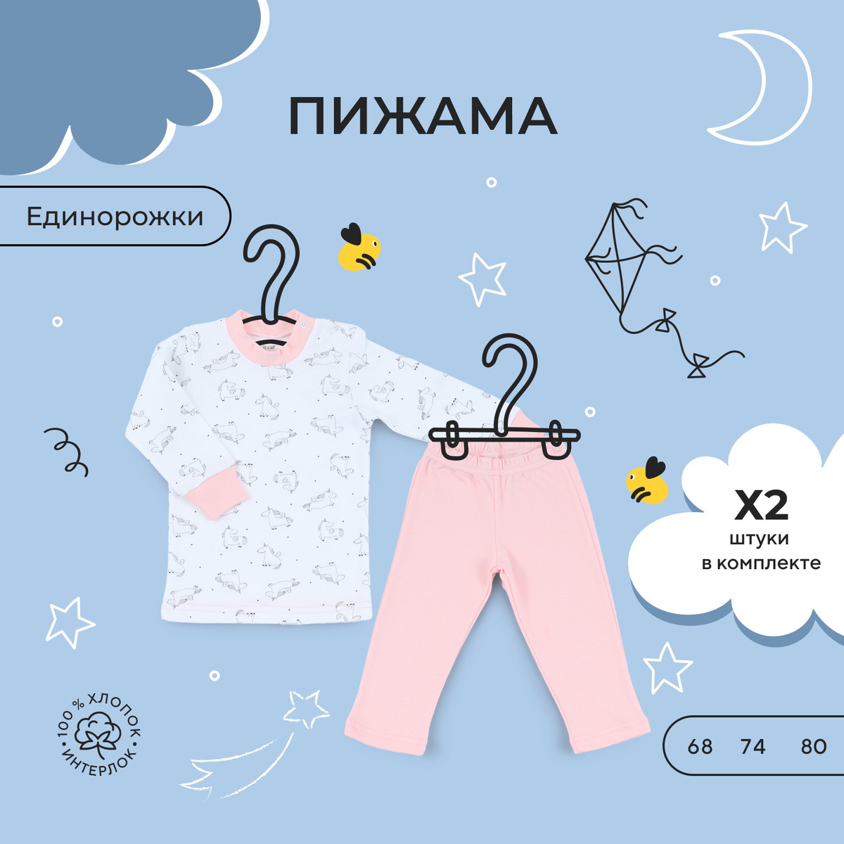 Трогательная коллекция Единорожек подарит вам самые нежные ощущения от использования. Базовые изделия из готового набора помогут с легкостью сочетать предметы гардероба между собой. Прибавьте к этому сказочный контурный принт, актуальные цвета, лаконичное исполнение, комфортное лекало, качественную фурнитуру в тон и хлопок премиум класса (интерлок-пенье).