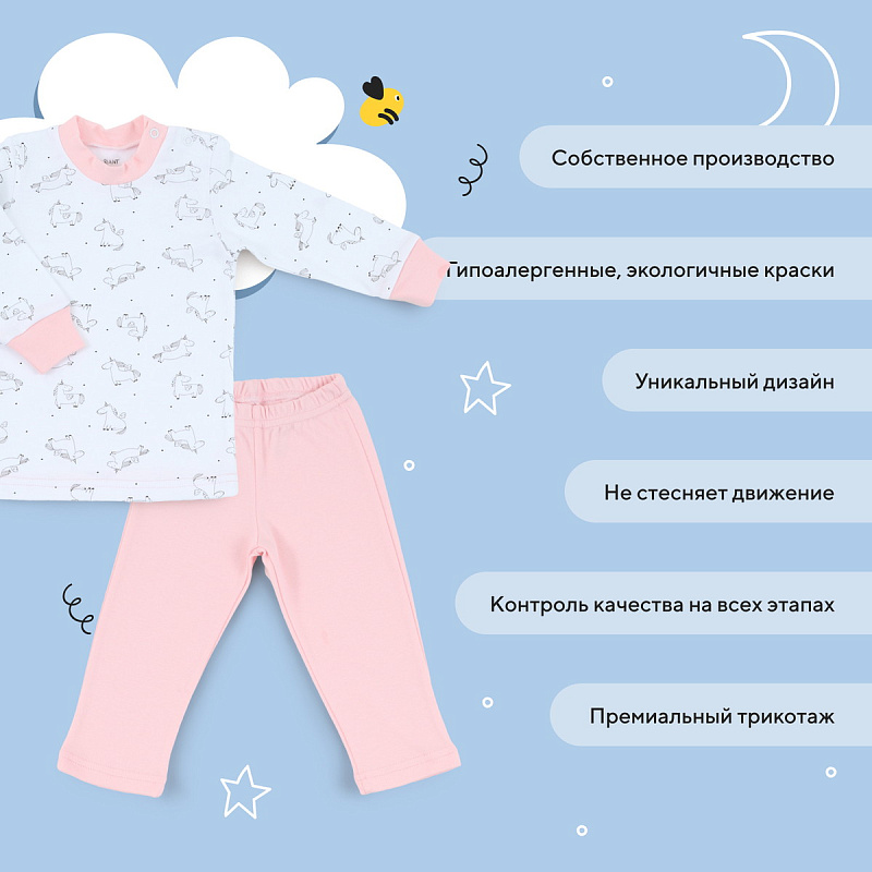 Очаровательная пижамка поможет малышу плавно погрузиться в сладкий сон. Мягкая резиночка, которой дополнены штанишки, не будет давить на крохотный животик. А кнопочки, которыми обеспечена горловина лонгслива, помогут беспрепятственно переодевать ребенка.
