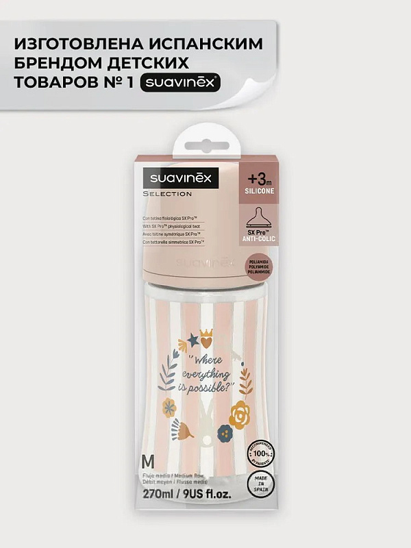 Антиколиковая бутылочка Suavinex с силиконовой физиологической соской SX Pro делает процесс кормления максимально естественным и помогает предотвратить возникновения коликов.