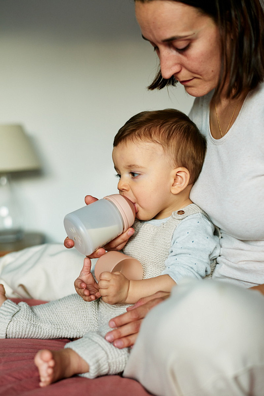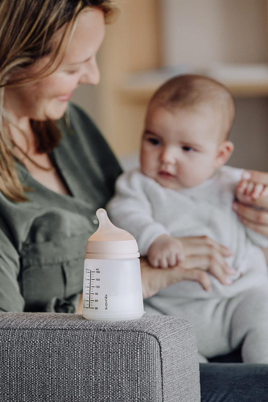 - Бутылочка оснащена уникальным антиколиковым силиконовым мешочком, который сжимается в процессе кормления, предотвращая попадание лишнего воздуха и создавая физилогичное давление при сосании, схожее с материнской грудью. Этот механизм позволяет снизить возникновение коликов, а также риск дискомфорта и неприятных ощущений после еды.