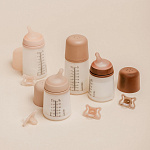 Бутылочка оснащена уникальным антиколиковым силиконовым мешочком, который сжимается в процессе кормления, предотвращая попадание лишнего воздуха и создавая физилогичное давление при сосании, схожее с материнской грудью. Этот механизм позволяет снизить возникновение коликов, а также риск дискомфорта и неприятных ощущений после еды.