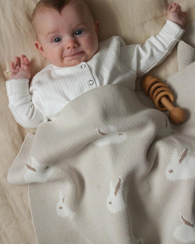 Пушистые кролики на вязаном пледе собирают для малыша добрые сказки еще до его рождения.