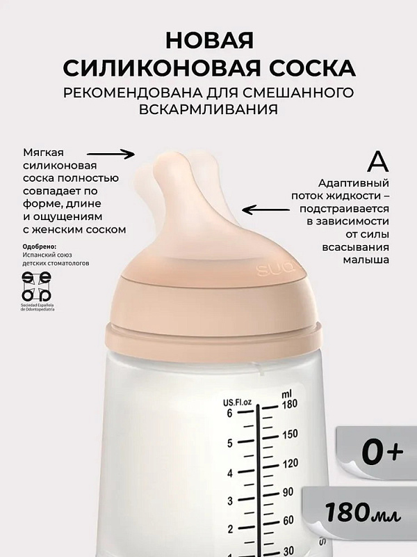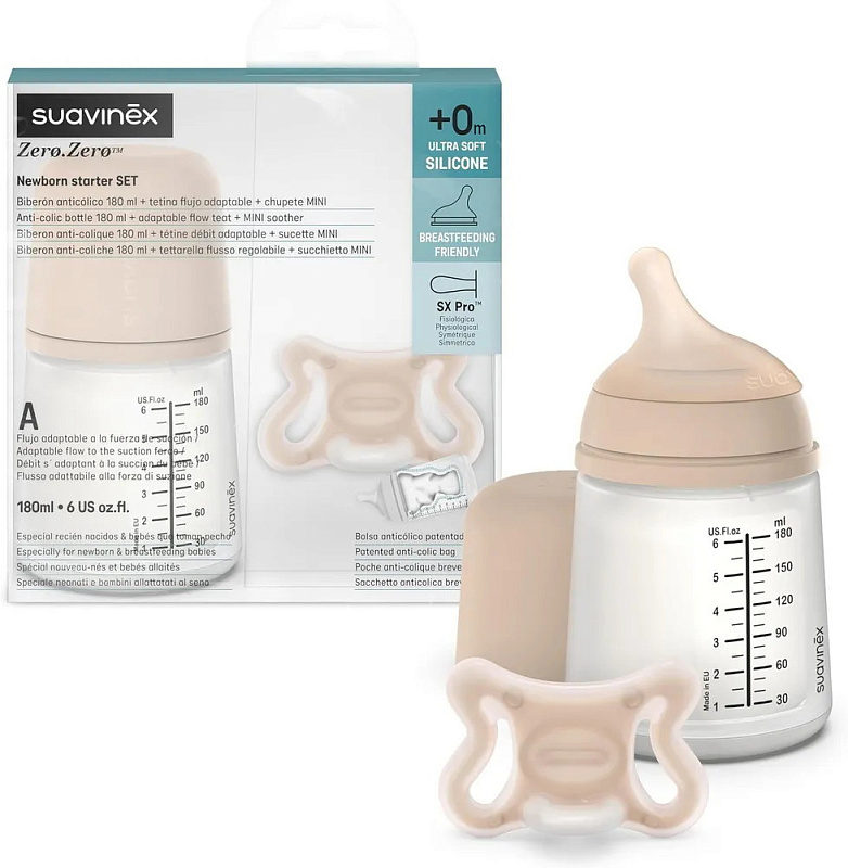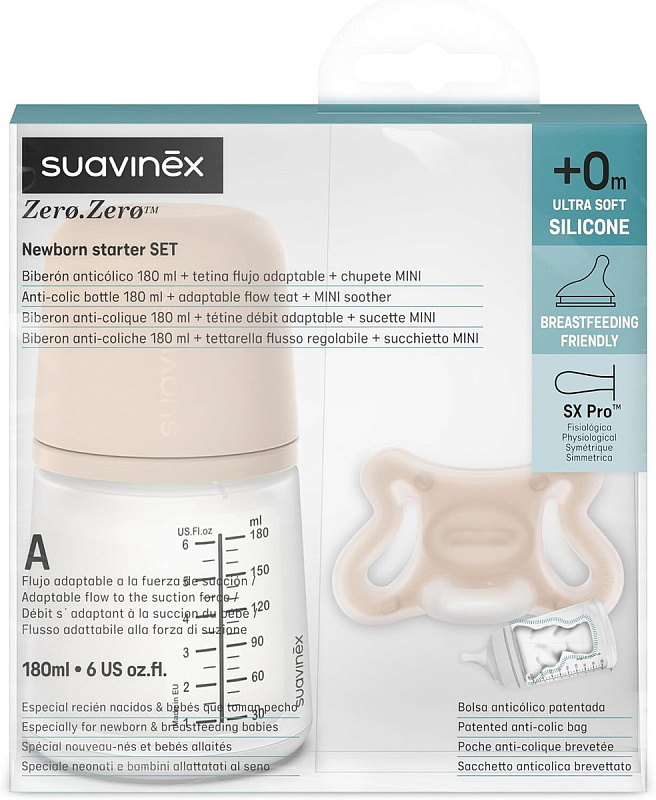 Детская бутылочка для кормления Suavinex Zero.Zero 180 мл с адаптивным потоком разработана для малышей с рождения. Она идеально подходит с первых дней жизни для смешанного кормления (грудным молоком и смесью, либо сцеженным грудным молоком из бутылочки) и искусственного вскармливания детской смесью.