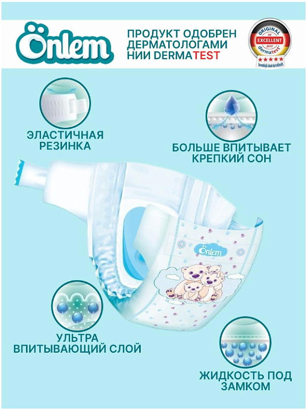 Подгузники Önlem Classik обеспечат надежную защиту для нежной кожи малыша.  Дышащий внешний слой изготовлен из воздухопроницаемого материала. Идеальный микроклимат внутри подгузника.