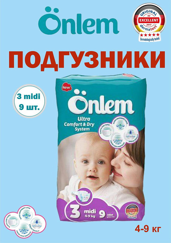 Подгузники детские Onlem Classik 3 midi 4-9 кг 9 шт