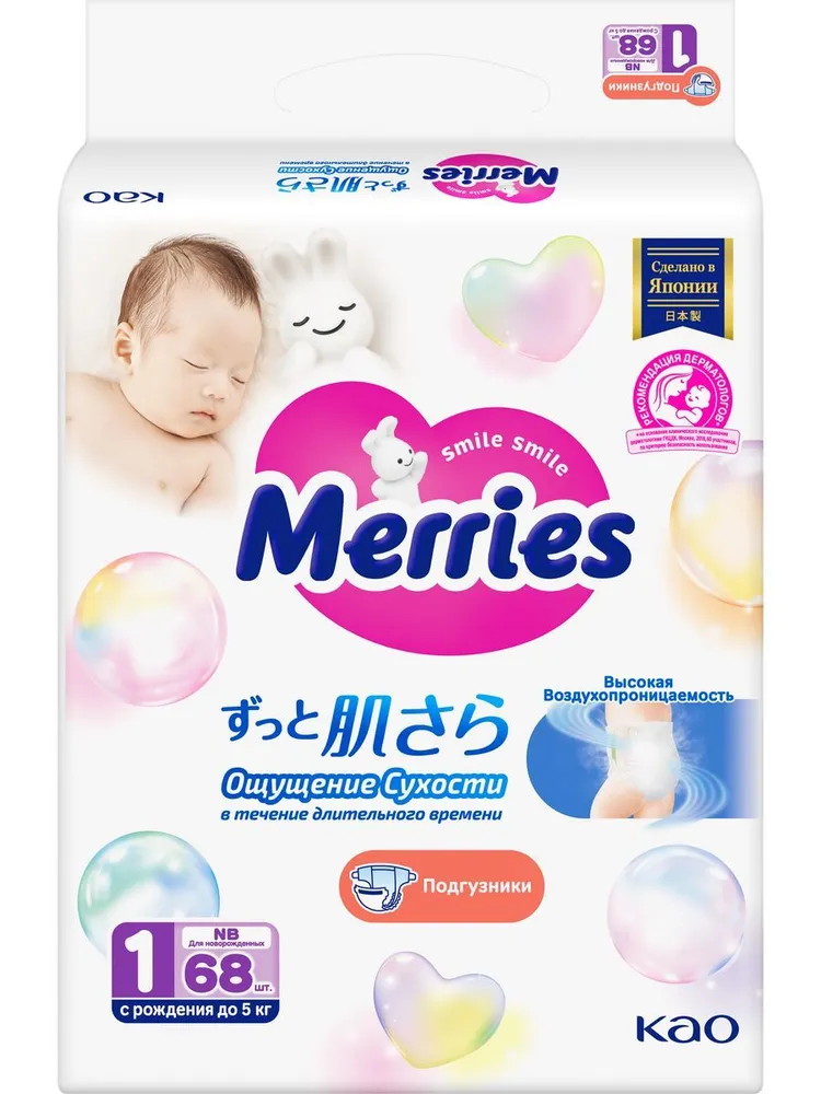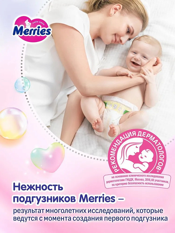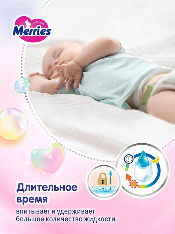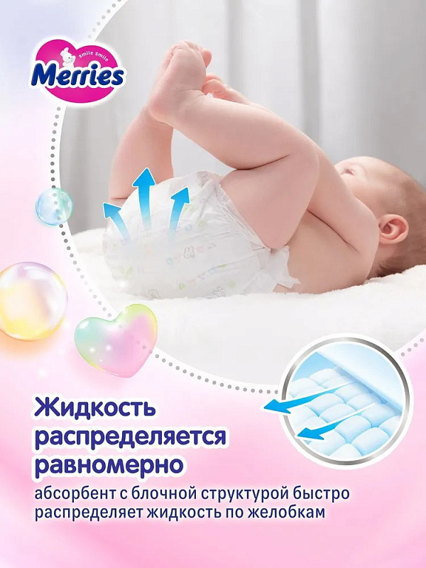 Детские одноразовые японские подгузники Merries (Меррис) для новорожденных малышей с весом до 5 кг (размер NB, 1) созданы с особенной заботой о коже и комфорте Вашего ребёнка. Merries – победитель премии «Марка №1 в России» в 2022 г. в категории «Подгузники и трусики для детей» и лучший бренд для малышей по признанию мам. Гипоаллергенные материалы, неощутимые на теле малыша, не вызывают раздражений, опрелостей и дискомфорта. Обновлённая технология трёх воздухопроницаемых слоёв сохраняет кожу малыша сухой и здоровой, обеспечивая свободное выведение прелого воздуха из подгузника. Полимерный абсорбент отлично впитывает большое количество жидкости, превращает её в гель и защищает от протеканий даже при значительном надавливании. Нежные воздушные подушечки внутреннего слоя теперь содержат в три раза больше воздуха в сравнении с предыдущим поколением подгузников Меррис. А волнистая бархатная поверхность уменьшает площадь соприкосновения подгузника с кожей, что особенно важно на этапе развития малыша, когда он больше лежит. Новый материал с увеличенными ячейками в центральной зоне подгузника моментально впитывает влагу и минимизирует её контакт с чувствительной кожей малыша. Мелкие ячейки по бокам волнистого слоя надёжно удерживают жидкий стул, который характерен в первые месяцы жизни, предотвращая его растекание по подгузнику. Внутренняя поверхность подгузника остаётся удивительно мягкой для кожи ребёнка и не прилипает к попке даже после того, как впитает большой объём жидкости. Трёхполосный индикатор наполнения легко проверить, не раздевая полностью малыша. Если полоски сменили цвет, подгузник пора заменить на новый. Впитывающий слой располагается по всей поверхности подгузника, поэтому жидкость не скапливается в одном месте, подгузник не сбивается в комок, не провисает и не стесняет движений малыша. Подгузники Merries подходят для девочек и для мальчиков. Не требуют использования защитных кремов и присыпок. Почти не заметны под одеждой и меняются бесшумно: вы не разбудите своего кроху шуршанием материала и фиксирующих липучек во время сна. Детские одноразовые подгузники Merries выпускаются во всех необходимых размерах и в нескольких вариантах комплектации. NB (размер 1, до 5 кг), S (размер 2, 4-8 кг), M (размер 3, 6-11 кг), L (размер 4, 9-14 кг). Все товары Merries разработаны в Японии с постоянным контролем качества производства и используемых материалов. Здоровье и комфорт для счастливых улыбок малышей и мам – это наши задачи и приоритеты непрерывного совершенствования качества продукции Merries.