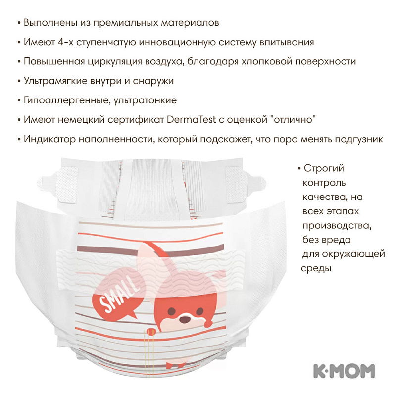Подгузники от корейского бренда K-MOM это инновационная разработка в индустрии одноразовых подгузников, которая содержит 4-х ступенчатую систему поглощения жидкости, что минимизирует протекание практически до нуля. Супертонкие, ультрамягкие и дышащие подгузники подарят комфорт Вашему малышу и защитят его от аллергических реакций. Имеют немецкий сертификат DermaTest, с оценкой "отлично", полученный в 2020 году, что делает подгузник абсолютно безопасным.