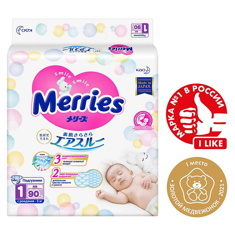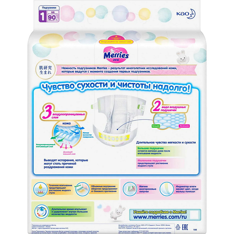 Нежные воздушные подушечки. В 3 раза больше воздуха! (в сравнении со средним показателем объема воздуха в волнистом слое подгузников Merries предыдущего поколения).