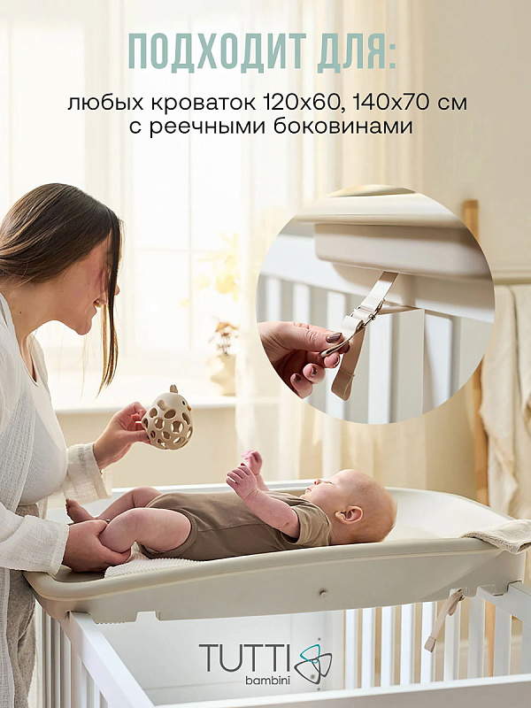 Подложка Cushi сделана с заботой о родителях: она подходит для разных пеленальных поверхностей! Вы можете использовать ее на комоде, тумбе, столике, различных кроватках с реечными боковинами (120х60, 140х70 см). Небольшой вес позволяет легко перенести подложку с кроватки на комод. Для безопасной установки на бортики кроватки предусмотрены надежные ремни — они уже входят в комплект.