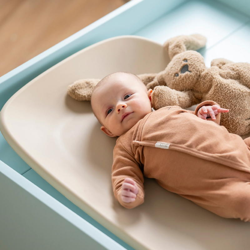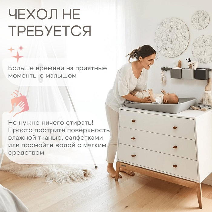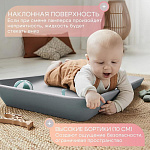 Инновационная пеленальная подложка из пенополиуретана. Ее можно использовать без чехла, что экономит время и позволяет легко производить каждую смену белья! Пенополиуретан не только мягкий на ощупь, этот прочный и гигиеничный материал также обладает водоотталкивающими свойствами. Пенополиуретан быстро впитывает комнатную температуру и имитирует мягкость вашей кожи. Эргономичный дизайн обеспечивает дополнительный комфорт и устойчивость во время пеленания. Слегка наклонная поверхность и приподнятые края обеспечивают удобное положение лежа и предотвращают перекатывание ребенка на бок во время гигиенических процедур и смены подгузника. Кроме того, все жидкости отводятся от головки ребенка и не могут стекать на дно пеленального столика. После использования вы можете легко протереть пеленальный столик влажной тканью с мылом или дезинфицирующим спиртом. Подложка не содержит BPA и соответствует европейским нормам безопасности и качества.