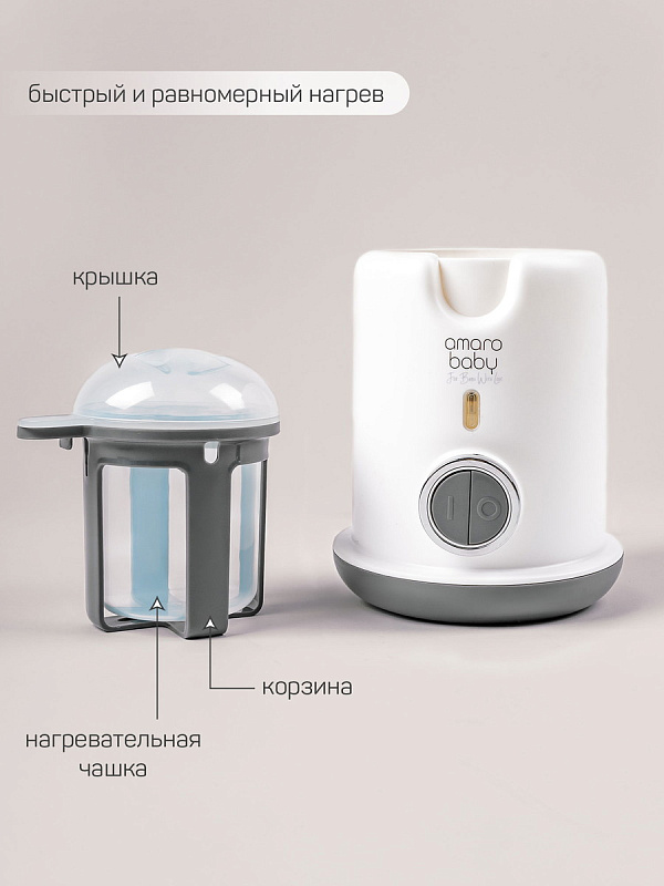 Универсальный стерилизатор-подогреватель Amarobaby для бутылочек станет незаменимым помощником на Вашей кухне. Стерилизатор-подогреватель предназначен для подогрева воды, молока и питания для новорожденных. Многофункциональный подогреватель для бутылочек не только быстро и просто разогревает молоко или детское питание в течение нескольких минут, но и стерилизует детские бутылочки благодаря силе пара. Встроенная корзина для подогрева и подставка для подогрева позволяют использовать бутылочки, стаканы, а также более мелкие предметы, такие как соски. Температура нагревается за несколько минут в зависимости от начальной температуры жидкости. В комплект входит мерный стаканчик. Подогреватель Amarobaby разогреет молоко и другую пищу, сохраняя все полезные свойства, содержащиеся в продуктах.