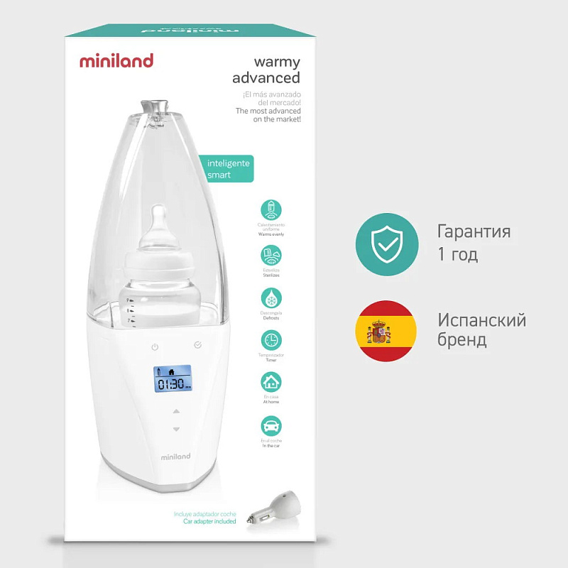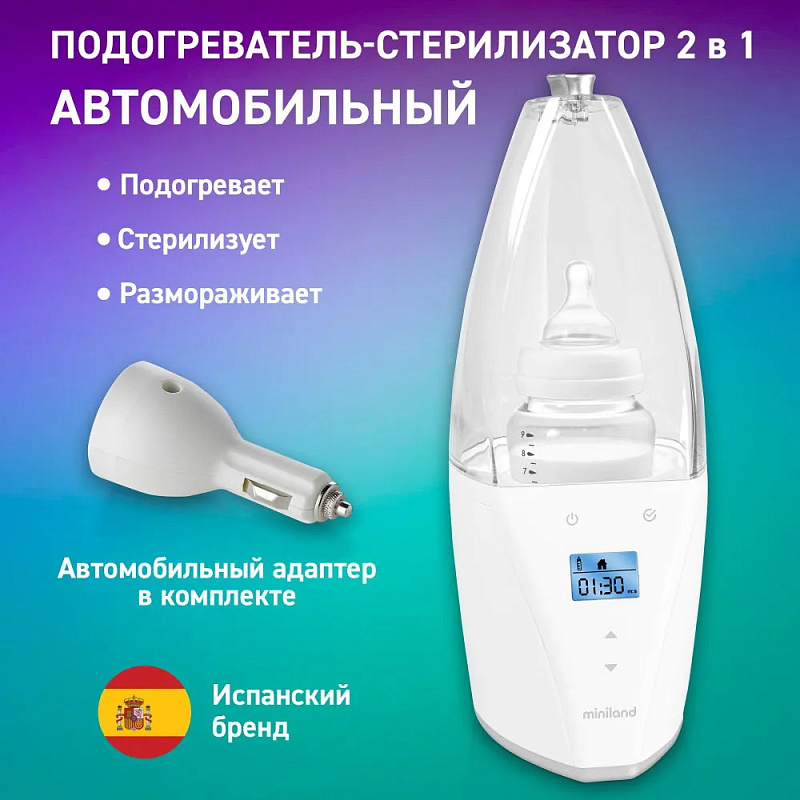 Стерилизаторы-подогреватели детских бутылочек – крайне полезный прибор. С их помощью очень легко поддерживать детскую посуду в чистоте или подогревать молоко, воду, соки и жидкие каши в бутылочках. При производстве стерилизатора бутылочек 2 в 1 испанская компания Miniland применила совершенно иной подход. Она создала универсальный продукт, который пригодится в разных ситуациях. Пользоваться стерилизатором-подогревателем детских бутылочек можно как дома, так и во время поездок (через прикуриватель).