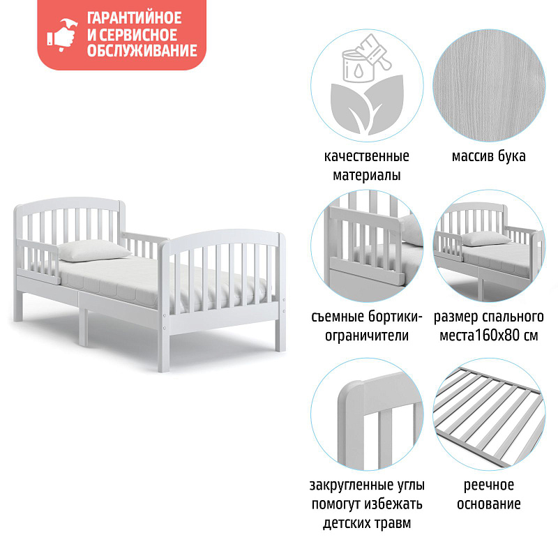 Элегантная модель, выполненная в стиле минимализма, с красивыми полукруглыми решетчатыми спинками идеально впишется в интерьер детской и обеспечит малышу безопасный и здоровый отдых.