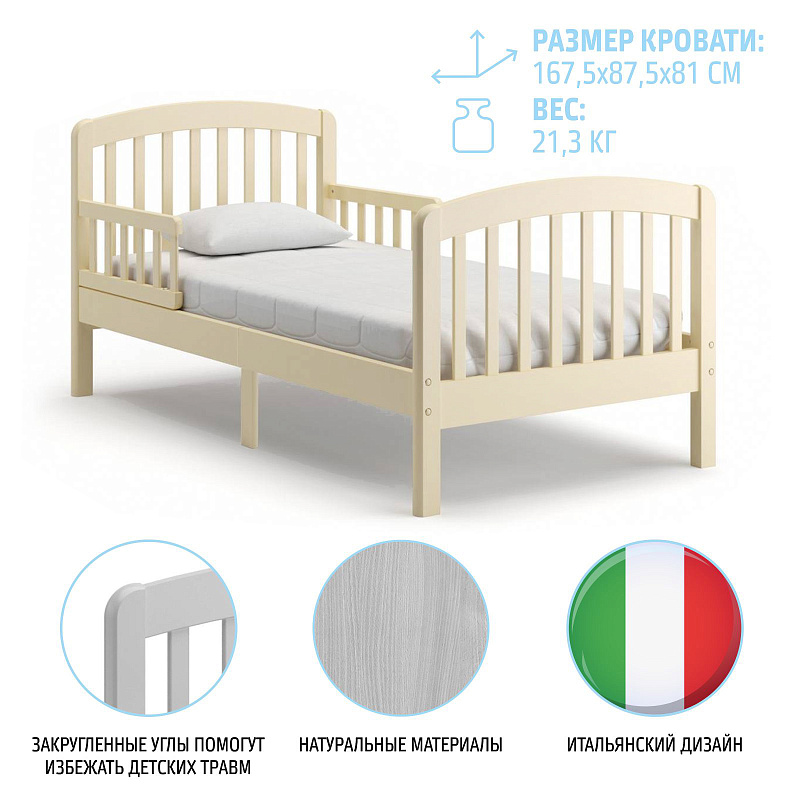 Элегантная модель, выполненная в стиле минимализма, с красивыми полукруглыми решетчатыми спинками идеально впишется в интерьер детской и обеспечит малышу безопасный и здоровый отдых.
