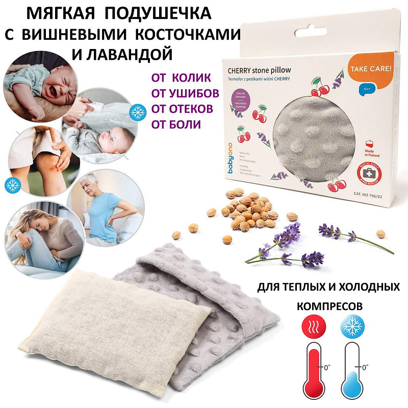 Подушечка-грелка для детей с вишневыми косточками и нежным ароматом лаванды от польского производителя BabyOno – натуральный и безопасный продукт для детей и взрослых, идеально подходящий для того, чтобы снять дискомфорт и создать расслабляющую атмосферу. Это естественный и эффективный способ снять колики у малышей.